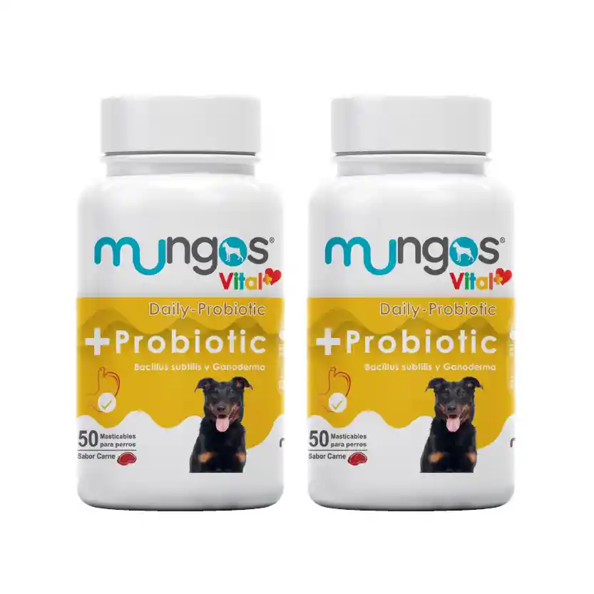 Mungos VITAL+ PROBIOTIC: Es un suplemento alimenticio con probióticos y prebióticos para suministrar a perros cachorros, adultos y senior de todas las razas. En nuestros peludos la microbiota intestinal puede verse afectada por estrés, mala calidad de la dieta, medicamentos, entre otros.