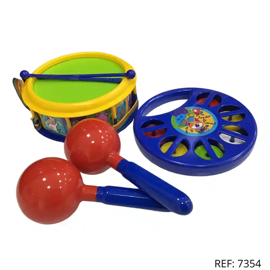 Set musical infantil con tambor, pandereta y maracas. Ideal para desarrollar ritmo, coordinación y creatividad desde temprana edad.