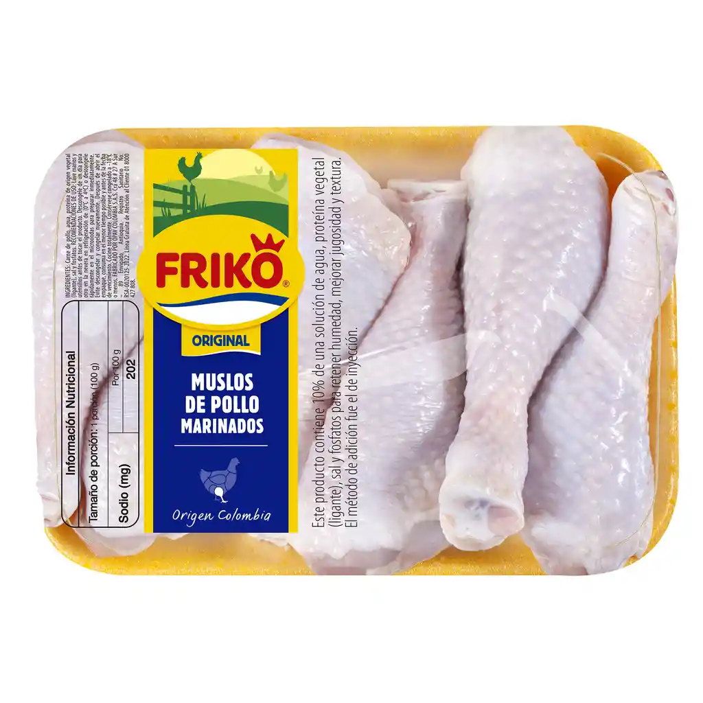 Empacados en bandeja por 6 unidades alternando su posición a lo largo de la bandeja y sellados con PVC transparente o en material termoencogible sellado en empacadora automática. Etiqueta muslo marinado: se ubica centrada en el lado izquierdo de la bandeja después de sellar en la cara superior del producto.
