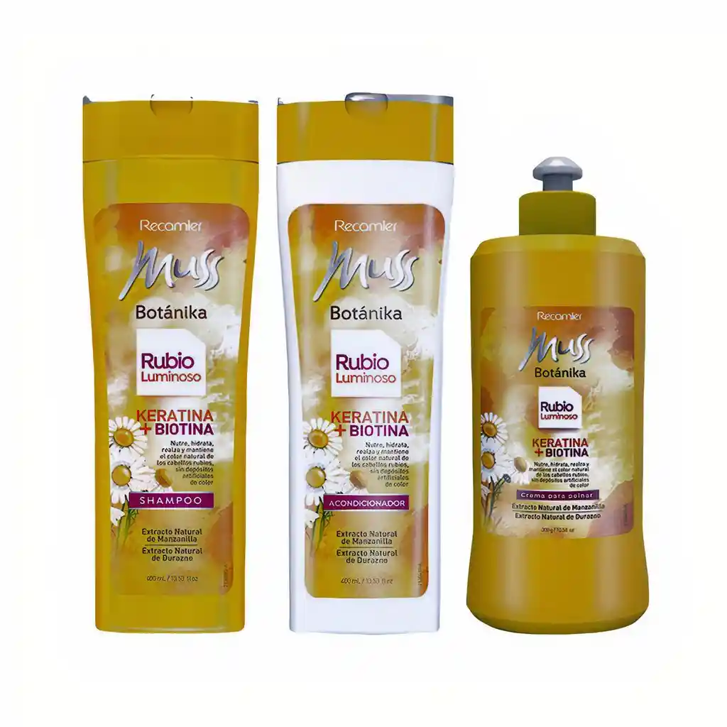 El shampoo rubio, luminoso, limpia, nutre el cabello, brindando hidratación, realzando el color, gracias a sus ingredientes naturales. Con este producto obtendrás resultados increíbles, tu cabello tendrá una mejoría extrema, gracias a su exclusiva fórmula que combina keratina, biotina, un mix de extractos naturales de manzanilla, durazno, que le darán mayor fuerza, brillo y nutrición a tu cabello. Contiene un shampoo, un acondicionador y una crema para peinar.
