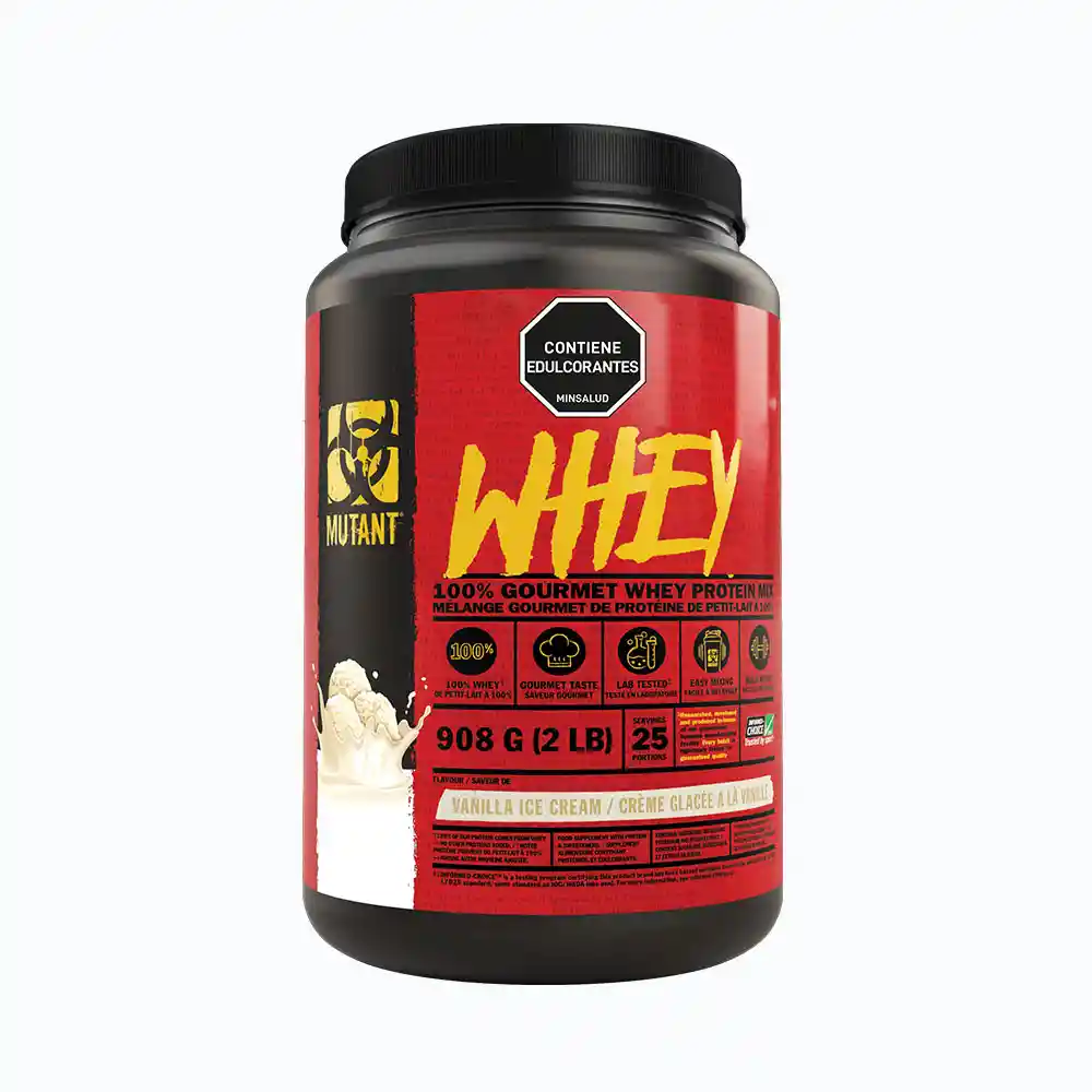 Mutant Whey Fórmula de combinación de 3 tipos de proteína de suero para obtener un producto final con un alto contenido en péptidos bioactivos. Ingredientes: Proteína concentrada de suero de leche, caseinato de calcio, proteína aislada de suero, caseína micelar, proteína hidrolizada de suero, maltrodextrina, sabores naturales y/o artificiales, aceite de girasol, jarabe de solidos de maíz (endulcorante),caseinato de sodio (agente espesante), fosfato dipotásico (agente leudante), fosfatos tricálcico (agente leudante), lecitina de soya (emulgentes), mono y diglicéridos de ácidos grasos (emulsionantes), sal yodada y fluorizida de apta para consumo humano, agentes espesantes (goma de celulosa, goma xantanas, carragenina), sucralosa y/o acesulfame de potasio (endulcorantes artificiales), mezcla de vitaminas y minerales (palmitato, vitamina A, ácido ascórbico, betacaroteno, tiamina, riboflavina, niacina, piridoxina, ácido fólico, biotina, carbonato de calcio, fosfato férrico , fosfato de yodo, oxido de magnesio, oxido de zinc, selenito de sodio, sulfato). Fabricado en una plata que también procesa ingredientes a base de trigo, huevo, nueces, maní y pescado.