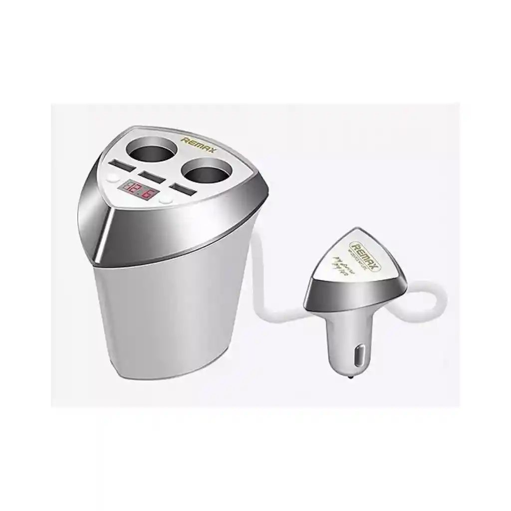 Cargador para carro con entrada triple USB y dos conexiones más para entrada de carro, tiene la forma de el portavasos del carro