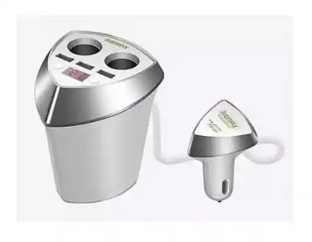 Cargador para carro con entrada triple USB y dos conexiones más para entrada de carro, tiene la forma de el portavasos del carro
