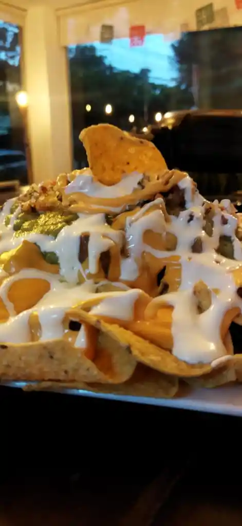 Totopos de maíz bañados en queso mozzarella, cheddar, frijol refrito, Carne de Res desmecha, acompañado de guacamole, pico de gallo, sour cream y caldo de birria