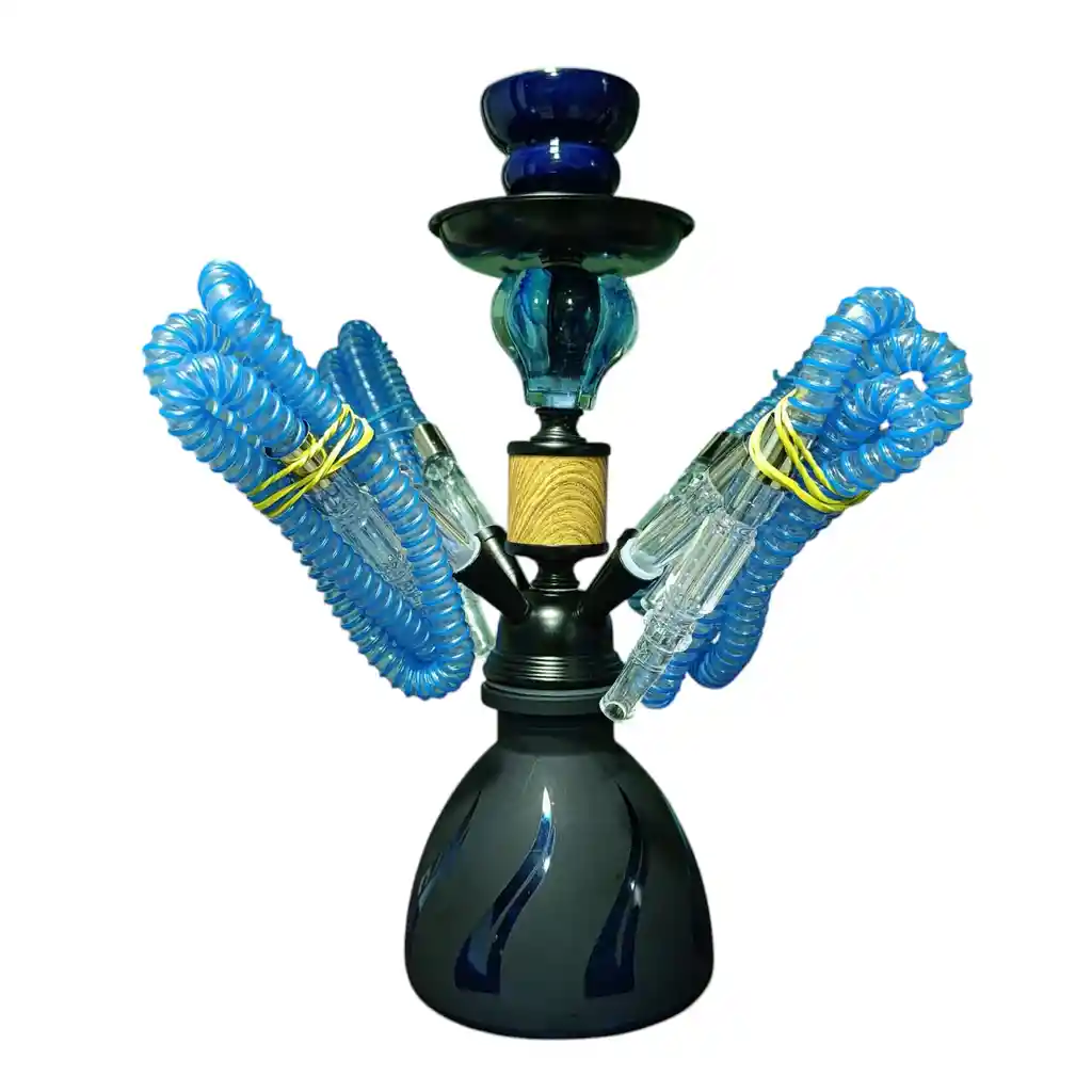 Narguila pequeña de cristal azul oscuro con detalles metálicos y 4 mangueras. Compacta, elegante y lista para compartir.