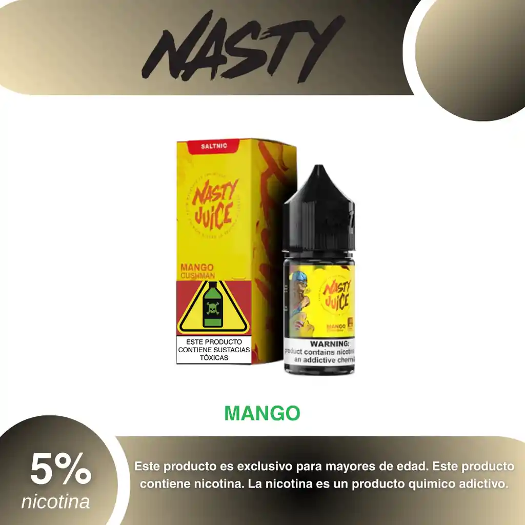 Sales Nasty Juice 30 Ml Sabor Mango 5% PROHIBIDA LA VENTA A MENORES DE EDAD. ADVERTENCIA: ESTE PRODUCTO CONTIENE NICOTINA, LA NICOTINA ES UNA SUSTANCIA QUIMICA ADICTIVA Y NOCIVA PARA LA SALUD. Los líquidos para vapeo contienen: propilenglicol USP, glicerina USP, sabor artificial y nicotina. Este producto puede contener nicotina, una sustancia altamente adictiva que puede generar dependencia, posibles afectaciones arteriales, cardiacas, pulmonares y otras aun no identificadas. No se recomienda su uso a mujeres en embarazo, puede generar lesiones al feto. Mantener alejado de niños y mascotas. No ingerir, puede generar irritación y/o intoxicación. Por favor antes de consumir consulte a su médico posibles afectaciones o sensibilidad a alguno de sus componentes. Los componentes de este producto pueden aumentar la sensación de ansiedad En caso de notar alguna reacción adversa por favor suspenda su uso de manera inmediata. Siga las instrucciones en el envase. No alterar sus componentes. Adquiera sus productos en sitios de confianza No use productos piratas, alterados, o en los cuales no pueda comprobar su buena procedencia, Verifique la reputación del fabricante y distribuidor antes de adquirir cualquier producto Si no es usuario fumador o vapeador no se recomienda su uso bajo ninguna circunstancia Al usar este producto usted es consciente que este producto puede generar afectaciones a su salud, incluyendo aquellas que a la fecha de la compra no se han identificado y que pueden aparecer a largo plazo.