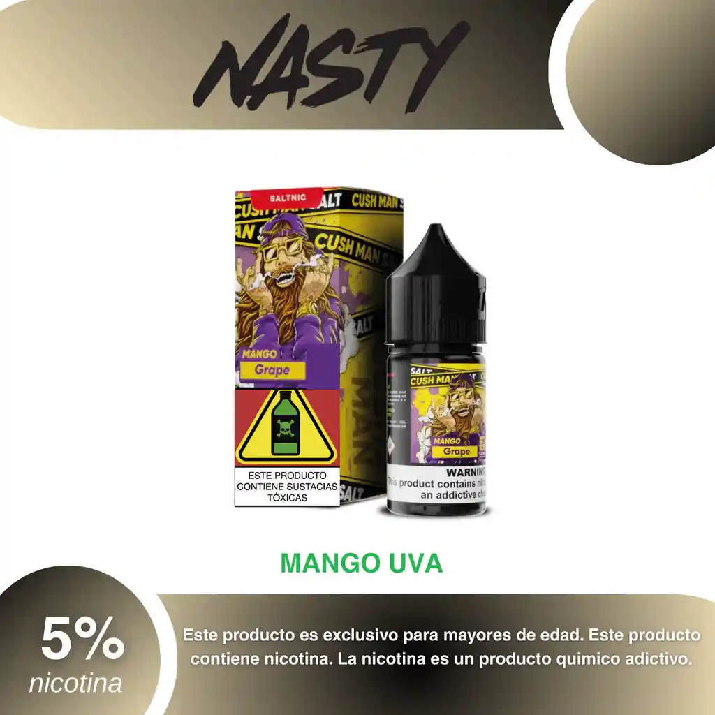 Sales Nasty Juice 30 Ml Sabor Mango Uva 5% PROHIBIDA LA VENTA A MENORES DE EDAD. ADVERTENCIA: ESTE PRODUCTO CONTIENE NICOTINA, LA NICOTINA ES UNA SUSTANCIA QUIMICA ADICTIVA Y NOCIVA PARA LA SALUD. Los líquidos para vapeo contienen: propilenglicol USP, glicerina USP, sabor artificial y nicotina. Este producto puede contener nicotina, una sustancia altamente adictiva que puede generar dependencia, posibles afectaciones arteriales, cardiacas, pulmonares y otras aun no identificadas. No se recomienda su uso a mujeres en embarazo, puede generar lesiones al feto. Mantener alejado de niños y mascotas. No ingerir, puede generar irritación y/o intoxicación. Por favor antes de consumir consulte a su médico posibles afectaciones o sensibilidad a alguno de sus componentes. Los componentes de este producto pueden aumentar la sensación de ansiedad En caso de notar alguna reacción adversa por favor suspenda su uso de manera inmediata. Siga las instrucciones en el envase. No alterar sus componentes. Adquiera sus productos en sitios de confianza No use productos piratas, alterados, o en los cuales no pueda comprobar su buena procedencia, Verifique la reputación del fabricante y distribuidor antes de adquirir cualquier producto Si no es usuario fumador o vapeador no se recomienda su uso bajo ninguna circunstancia Al usar este producto usted es consciente que este producto puede generar afectaciones a su salud, incluyendo aquellas que a la fecha de la compra no se han identificado y que pueden aparecer a largo plazo.