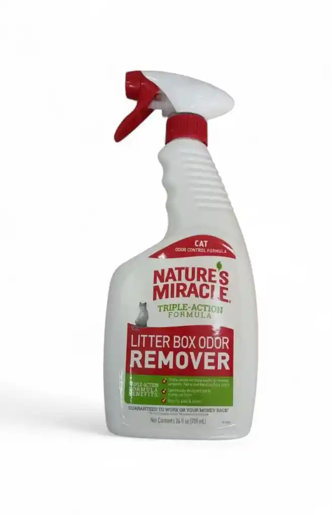 El producto utiliza una fórmula bioenzimática de triple acción que funciona para descomponer y eliminar por completo las manchas y olores orgánicos de la orina, heces y vómito de gato, en lugar de simplemente enmascararlos. Es seguro para usar cerca de mascotas y en el hogar si se utiliza siguiendo las instrucciones.