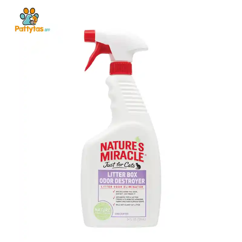 NATURE’S MIRACLE DESTRUCTOR DE OLORES PARA CAJA DE ARENA, destructor de olores para areneras de gato. Es ideal para hogares que tienen múltiples gatos En la caja de Arena: rocié generosamente en la caja de arena después del uso dado por gatos. En los tapetes usados para la caja de arena: antes de usar pruebe en una superficie oculta para evitar dañar el color del tapete si el color se daña no use el producto. Posterior a verificar rocié suave y uniformemente el producto sobre el tapete hasta que este ligeramente húmedo . En el piso: rocié el pido dónde se ubica la arenera suave ligeramente, limpié el exceso.