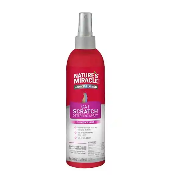 A veces tu gato necesita un poco de ayuda en el entrenamiento. Rascarse es un comportamiento instintivo del gato. Nature’s Miracle Cat Scratch Deterrent Spray está específicamente formulado para desalentar los arañazos destructivos en toda la casa en las superficies del hogar. Los olores repelentes disuaden a los gatos de regresar al área tratada. Aplique Nature’s Miracle Advanced Platinum Scratch Deterrent en las áreas que desea evitar que los gatos se rasquen. Para mejores resultados, aplique 3 rocíos por pie cuadrado. Vuelva a aplicar diariamente o según sea necesario hasta que se rompa el hábito indeseable, elogie al gato cuando muestre un comportamiento positivo.