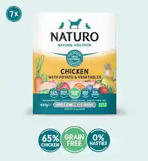 Alimento húmedo sin cereales para perros adultos, con salmón, papa y vegetales, ideal para digestiones sensibles, sin aditivos artificiales.