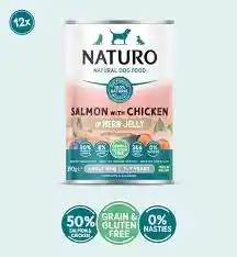 Comida húmeda natural para perros adultos, con salmón y pollo en gelatina de hierbas, sin cereales ni gluten, sin aditivos artificiales.