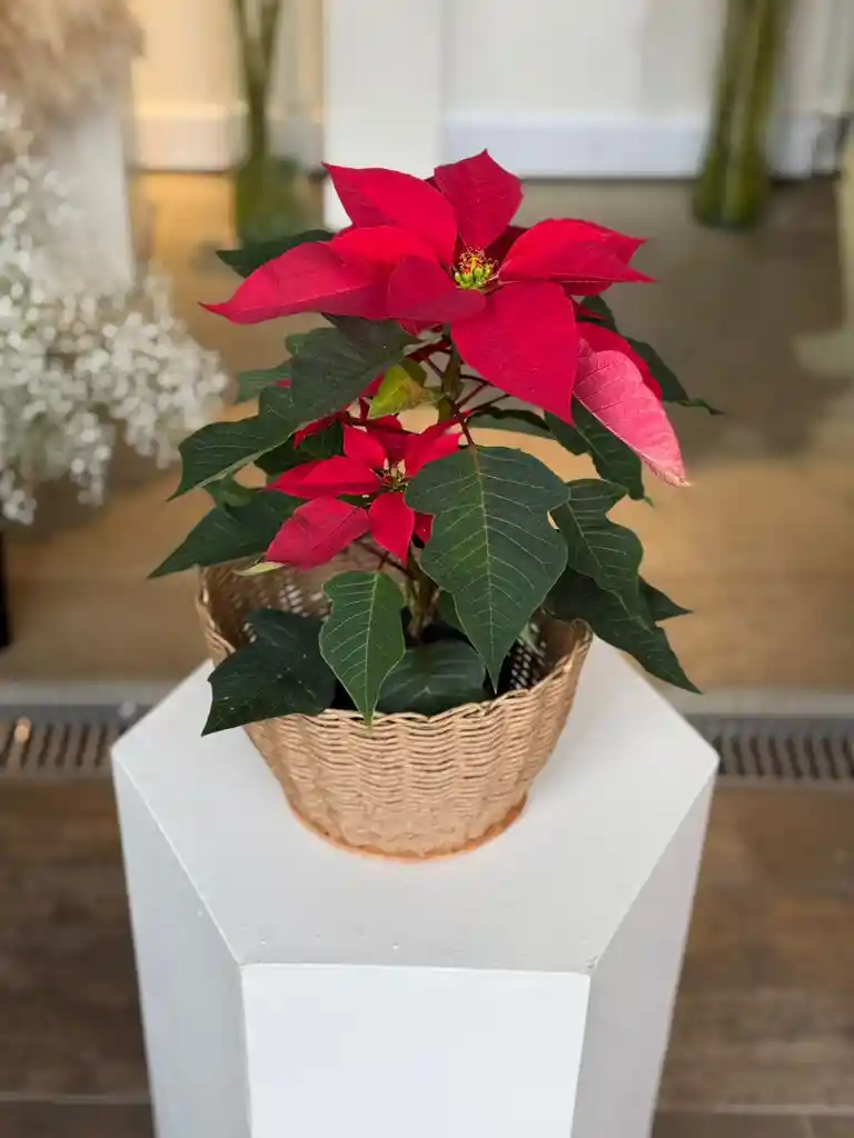Planta navideña poinsettia florecida, en matera hecha a mano.
