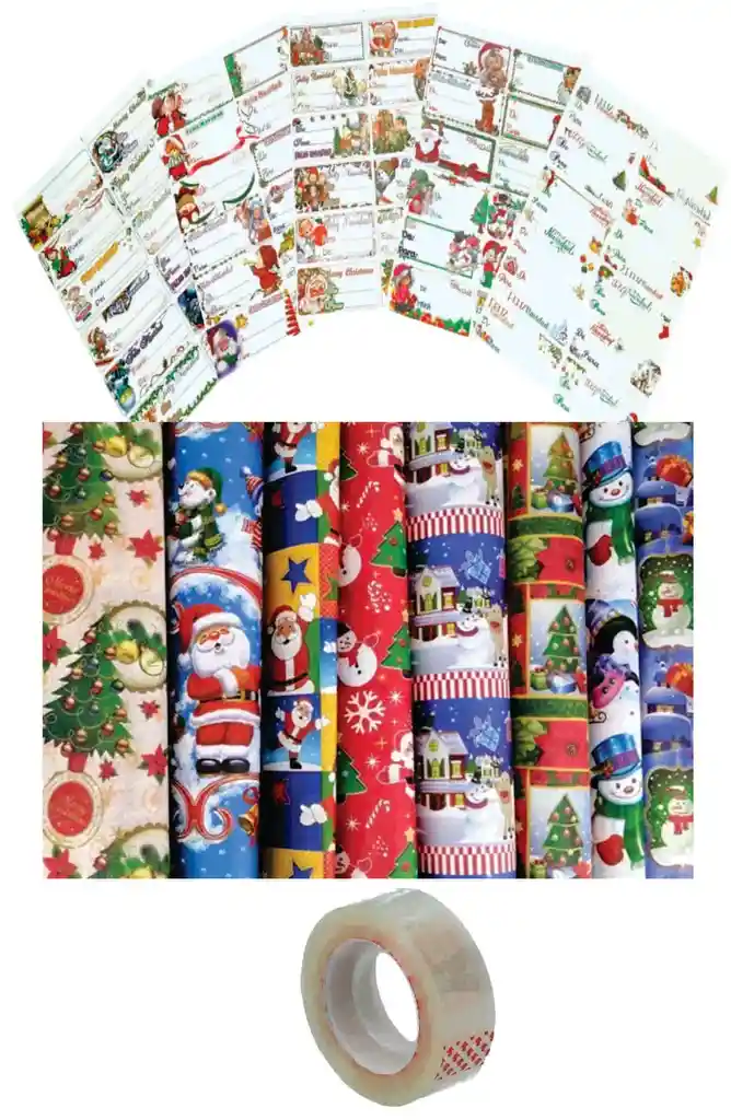Combo para empacar regalos 1 cinta 12x25, 1 hoja con 12 tarjetas Adhesiva Motivos navideños y 5 papel de regalos de navidad