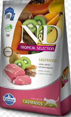 Alimento para su gato ND Tropical Selection Feline Alimento completo y balanceado para gatos adultos castrados Cerdo Adult Castrados disponible en estos tamaños 400g - 1.5kg - 7kg composición cerdo (carne de cerdo, harina de chicharrón (piel de cerdo) – mín. 5%), cereales y frutas (avena, granos de sorgo, cebada en granos, plátano deshidratado, papaya deshidratada, kiwi deshidratado, mango deshidratado – mín. 35%), harina de vísceras de pollo, grasa de cerdo, huevo en polvo, sub-producto de arroz, sub-producto de trigo, harina de pescado, aceite de pollo, aceite de pescado, pulpa de remolacha, alfalfa deshidratada, celulosa en polvo, levadura seca de cervecería (Saccharomyces cerevisiae), zanahoria deshidratada, aditivos prebióticos (FOS y MOS), DL-metionina, taurina, L-carnitina, sulfato de condroitina, sulfato de glucosamina, aditivos adsorbentes (extracto de yuca (Manihot esculenta) y zeolita), hidrolizado de hígado de aves y cerdos, vitaminas (A, D3, E, B1, B2, B5, B6, B12, C, biotina, niacina, ácido fólico, cloruro de colina), cloruro de sodio, cloruro de potasio, cloruro de amonio, hierro aminoácido quelato, cobre aminoácido quelato, zinc aminoácido quelato, manganeso aminoácido quelato, proteinato de selenio, yodato de calcio, propionato de calcio, concentrado de tocoferoles. Eventuales sustitutivos: proteína hidrolizada de pollo, proteína hidrolizada de pescado.