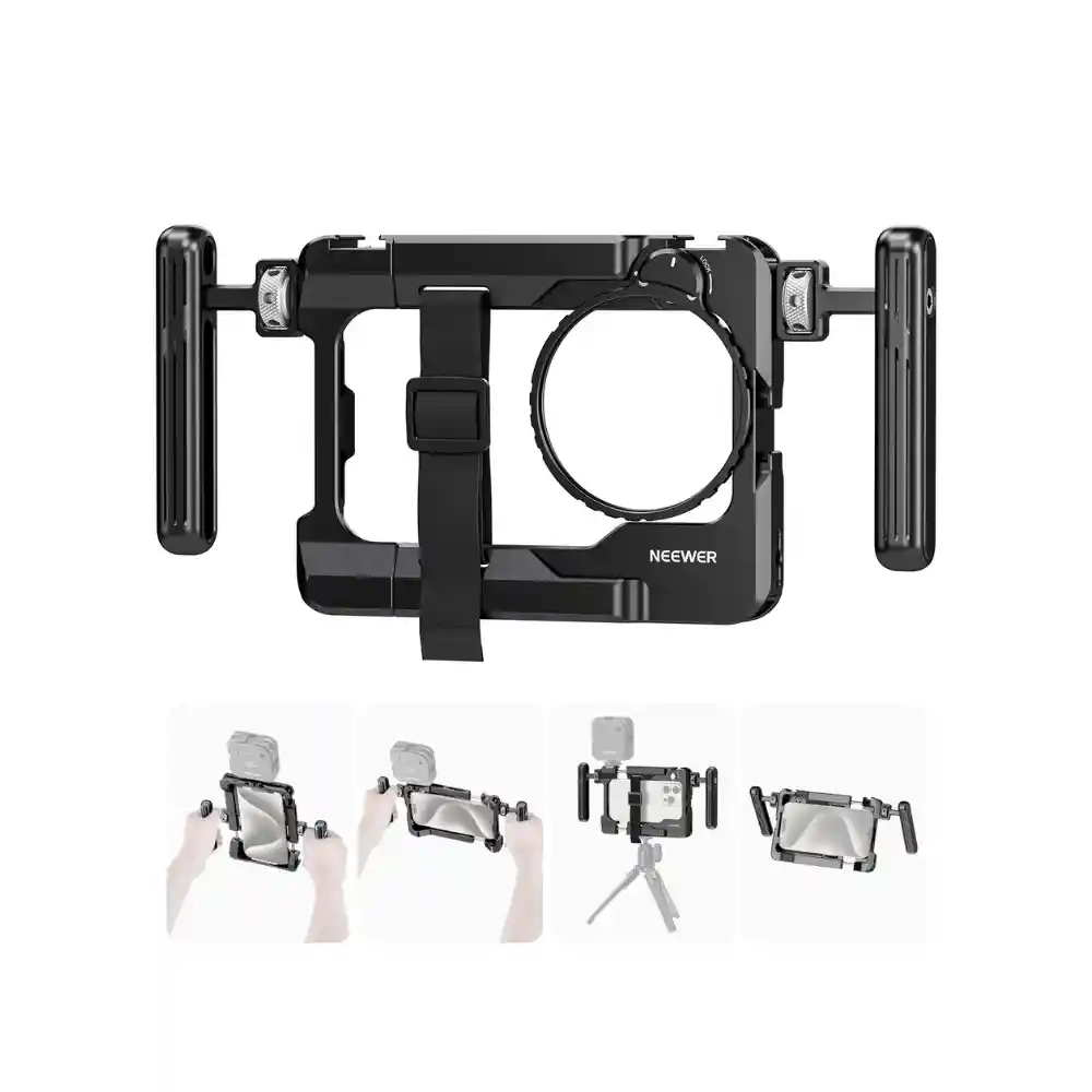 El Neewer Handheld Smartphone Cage PA017 es un accesorio profesional diseñado para mejorar la calidad de grabación en dispositivos móviles. Con su estructura ergonómica de aluminio y su adaptador de filtro de 67 mm, este cage permite montar accesorios adicionales como micrófonos, luces LED y lentes externas, brindando mayor estabilidad y versatilidad para creadores de contenido, vloggers y cineastas móviles. Características principales: Construcción de aluminio de alta resistencia: Ligero, duradero y diseñado para proteger el smartphone. Diseño ergonómico y portátil: Ideal para grabaciones en movimiento con un agarre cómodo y seguro. Adaptador de filtro de 67 mm: Permite el uso de filtros ND, CPL y otros para mejorar la calidad de imagen. Múltiples puntos de montaje: Incluye roscas de 1/4"-20 y zapatas frías para accesorios adicionales. Compatibilidad: Iphone 15 Pro MAX Especificaciones técnicas: Material: Aleación de aluminio Diámetro del adaptador de filtro: 67 mm Puntos de montaje: Orificios de 1/4"-20 y zapatas frías ] Incluye: 1 x Neewer Handheld Smartphone Cage PA017 1 x Adaptador de filtro de 67 mm 1 x Llave Allen para montaje 1 x Manual de usuario Lleva tu producción móvil al siguiente nivel con el Neewer PA017, diseñado para estabilidad, versatilidad y calidad profesional en cada toma.