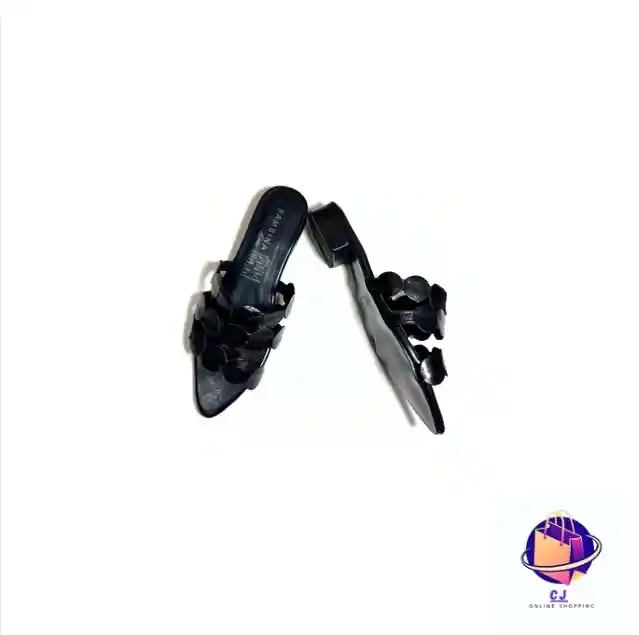 Sandalia plana en cuero negro mate. La parte frontal presenta un diseño de círculos entrelazados que cubren el empeine, ofreciendo un estilo minimalista y moderno. Tallaje disponible 36-39-40
