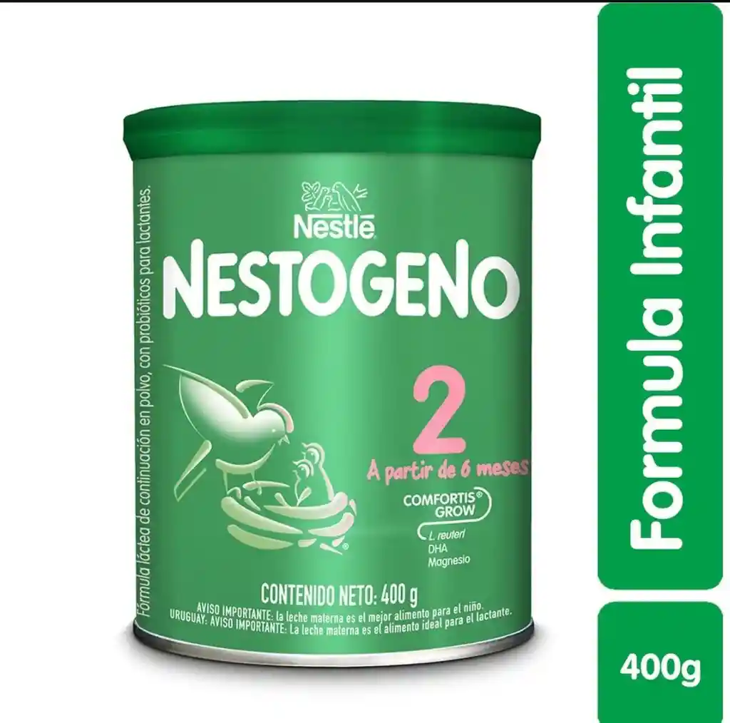 Leche en polvo NESTOGENO 2 es una fórmula infantil de iniciación con hierro para el lactante sanos a partir los 6 meses de v hasta los 12 meses. Su composición asegura un buen crecimiento y desarrollo, además ayuda a disminuir el riesgo de estreñimiento en bebés saludables y ayuda a disminuir el riesgo de dolor abdominal, ya que el estreñimiento es asociado a este malestar. Contiene probióticos l. reuteri. beneficios: proteina que ayuda a un adecuado crecimiento y desarrollo, asegura una buena digestión. probiótico l. reuteri: ayuda a prevenir el cólico del lactante. dha y ara: ácido graso esencial que ayuda a un adecuado desarrollo visual y cerebral del bebe. vitaminas y minerales: ayudan a un óptimo crecimiento y desarrollo.