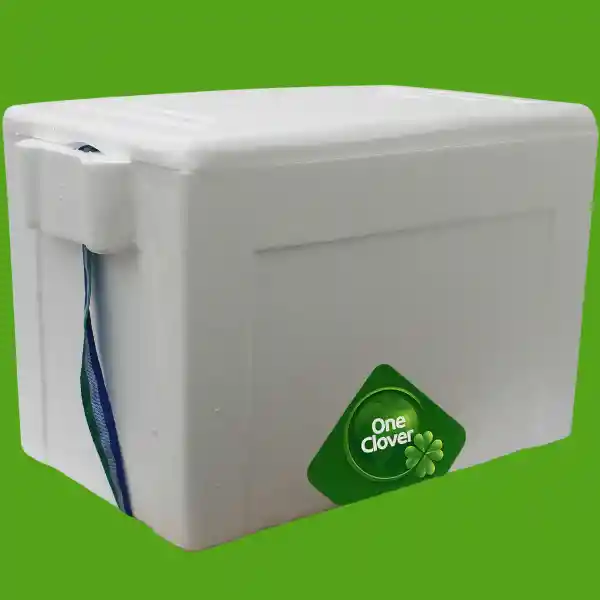 Nevera de poliestireno expandido (Icopor) CON COREA PARA SUJETAR ideal para el transporte de medicamentos, vacunas, alimentos u otros productos que requieran mantener la cadena de frío. Clase de material: Poliestireno expandible Densidad: 30 Kg/m³ +/- 10% Medidas internas : Largo: 46.5 cm Ancho: 27 cm Alto: 30.5 cm Medidas externas : Largo: 55 cm Ancho: 35.5 cm Alto: 35.5 cm Calibre: Pared: 4 cm Tapa: 5 cm Capacidad aprox: 44 litros Cierre: El cierre de tapa y caja es totalmente hermético. Partes y presentación de la nevera: Caja, tapa hermética, orejas laterales, reata con remache, empacada en bolsa plástica transparente Colores: Blanco fabricado : one clover sas.