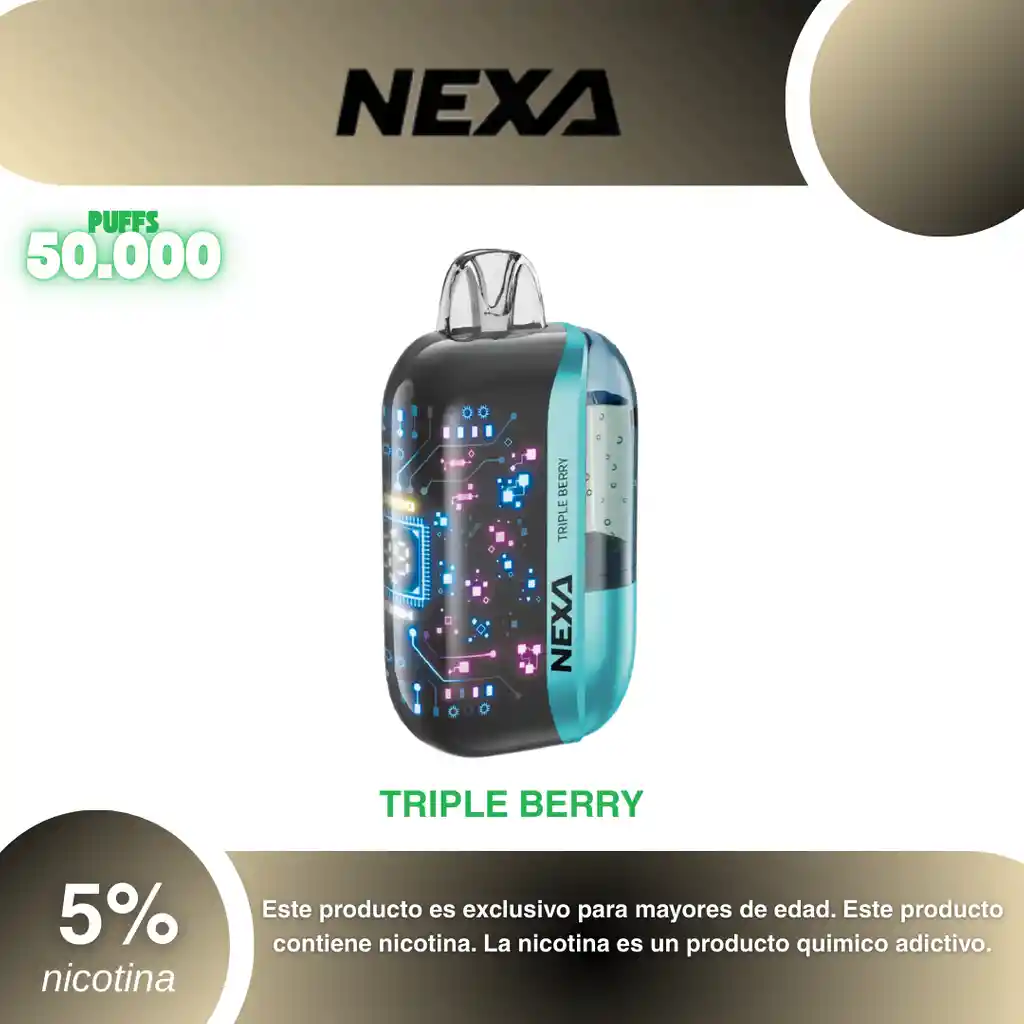 Nexa Ultra 50.000 Puffs, Sabor Frutos Rojos 5% PROHIBIDA LA VENTA A MENORES DE EDAD. ADVERTENCIA: ESTE PRODUCTO CONTIENE NICOTINA, LA NICOTINA ES UNA SUSTANCIA QUIMICA ADICTIVA Y NOCIVA PARA LA SALUD. Los líquidos para vapeo contienen: propilenglicol USP, glicerina USP, sabor artificial y nicotina. Este producto puede contener nicotina, una sustancia altamente adictiva que puede generar dependencia, posibles afectaciones arteriales, cardiacas, pulmonares y otras aun no identificadas. No se recomienda su uso a mujeres en embarazo, puede generar lesiones al feto. Mantener alejado de niños y mascotas. No ingerir, puede generar irritación y/o intoxicación. Por favor antes de consumir consulte a su médico posibles afectaciones o sensibilidad a alguno de sus componentes. Los componentes de este producto pueden aumentar la sensación de ansiedad En caso de notar alguna reacción adversa por favor suspenda su uso de manera inmediata. Siga las instrucciones en el envase. No alterar sus componentes. Adquiera sus productos en sitios de confianza No use productos piratas, alterados, o en los cuales no pueda comprobar su buena procedencia, Verifique la reputación del fabricante y distribuidor antes de adquirir cualquier producto Si no es usuario fumador o vapeador no se recomienda su uso bajo ninguna circunstancia Al usar este producto usted es consciente que este producto puede generar afectaciones a su salud, incluyendo aquellas que a la fecha de la compra no se han identificado y que pueden aparecer a largo plazo