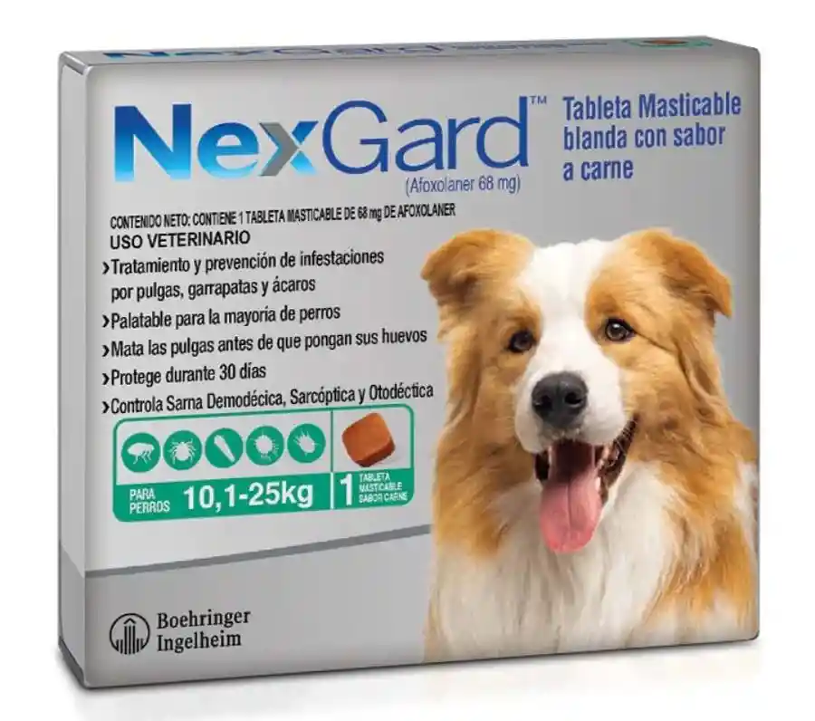 NexGard es una pastilla masticable mensual para perros que combate pulgas, garrapatas y otros parásitos externos, como los ácaros de la sarna, con un rápido inicio de acción y un sabor a carne que los perros suelen aceptar con facilidad.