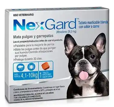 Nexgard para perros de 4 a 10 kg Poderosa prevención contra pulgas y garrapatas en una sola mordida. Nexgard es un comprimido masticable con eficacia comprobada para combatir y prevenir pulgas y garrapatas. Un solo bocado es suficiente y tu perro estará protegido contra las infestaciones parasitarias que pueden provocar enfermedades graves, como las que transmiten las garrapatas. Nexgard es muy apetecible y se puede ofrecer directamente al perro. Administre la tableta masticable de forma que anime al perro a masticarla. Se debe tener cuidado de que el perro consuma la dosis completa y se debe observar a los animales tratados durante unos minutos para asegurarse de que no se omite ni se rechaza una parte de la dosis. Si se sospecha que se ha omitido una parte de la dosis o toda la dosis o si se producen vómitos en las dos horas siguientes a la administración, administre una nueva dosis completa. Tratamiento y prevención de pulgas y garrapatas: el tratamiento con NexGard puede comenzar en cualquier momento del año. En las zonas donde las pulgas y/o garrapatas son frecuentes, se recomienda continuar el tratamiento mensual con NexGard durante todo el año, sin interrupción. Nexgard no es repelente; Indicaciones: Nexgard mata las pulgas y garrapatas en perros adultos y cachorros de más de 8 semanas de edad y con un peso mínimo de 2 kg. Está indicado para el tratamiento y la prevención de la infestación por pulgas y para el tratamiento y control de las garrapatas. Nexgard mata las pulgas antes de que pongan huevos. Debe administrarse una vez al mes; -Nexgard es muy sabroso; -Nexgard tiene un inicio de acción rápido y alcanza el 100% de eficacia en 8 horas contra las pulgas; -Nexgard controla rápidamente la reinfestación de pulgas y garrapatas adultas recién adquiridas durante un mes.