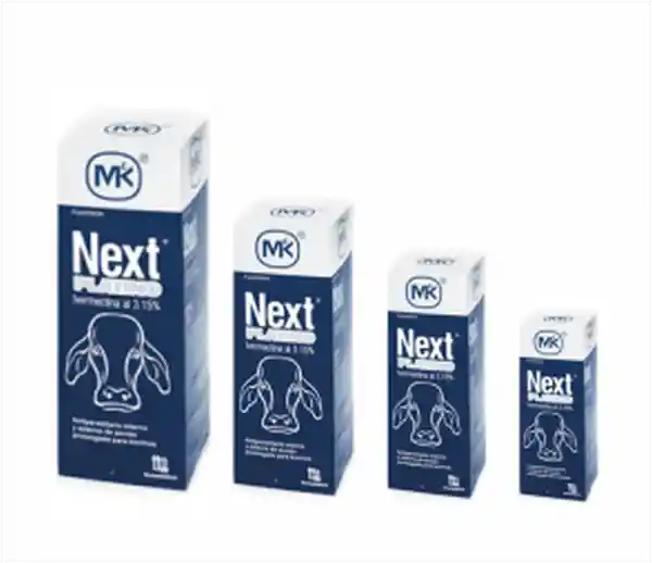 Next Platino, Ivermectina Mk Al 3,15% Solución Inyectable De Ivermectina Al 3,15% En Vehículo Especial Para Formulaciones De Larga Acción. Es Una Solución Estéril De Viscosidad Estable, Lista Para Su Uso, Que No Requiere Ser Agitada. Especies: Bovinos. Presentación: 20 Ml | 50 Ml |200 Ml | 500 Ml.
