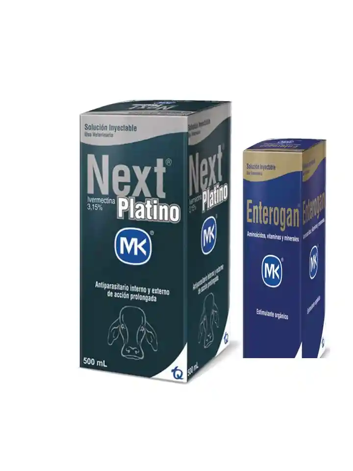NEXT PLATINO, IVERMECTINA MK AL 3,15% Solución inyectable de ivermectina al 3,15% en vehículo especial para formulaciones de larga acción. Es una solución estéril de viscosidad estable, lista para su uso, que no requiere ser agitada. PARÁSITOS INTERNOS GASTROINTESTINALES: (Formas adultas y larvarias en el cuarto estado) Haemonchus placei, Ostertagia ostertagi, Trichostrongylus axei, Cooperia onchophora, Cooperia punctata, Cooperia surnabada, Cooperia spp, Bunostomum phlebotomum, Oesophagostomum radiatum Formas adultas y larvarias de cuarto estado del parásito pulmonar Dictyocaulus viviparus PARÁSITOS EXTERNOS: Nuche: Dermatobia hominis (Fases parasitarias) Piojos: Linognathus vituli, Haematopinus eurysternus, Solonopotes capillatus, Damalinia bovis Ácaros de la sarna: Psoroptes communis var. Bovis, Sarcoptes capillatus, Chorioptes bovis Garrapatas: Boophilus microplus Miasis: NEXT PLATINO protege contra miasis causadas contra miasis causada por larvas de Cochliomya hominivorax, cuando se inyecta al tiempo que los animales sean expuestos a infestaciones, por ejemplo castraciones. Uso terapéutico: ENDECTOPARASITICIDA Principio Activo: IVERMECTINA Descripción: NEXT PLATINO es un endectoparasiticida Composición. ENTEROGAN Es un estimulante orgánico compuesto por aminoácidos esenciales y no es-enciales, vitaminas y minerales que es-timulan de manera benéfica las funciones orgánicas del animal. Enterogan MK, gracias a su fórmula ba-lanceada estimula el metabolismo para que actúe de una manera más rápida y eficaz. Especies: Bovinos.