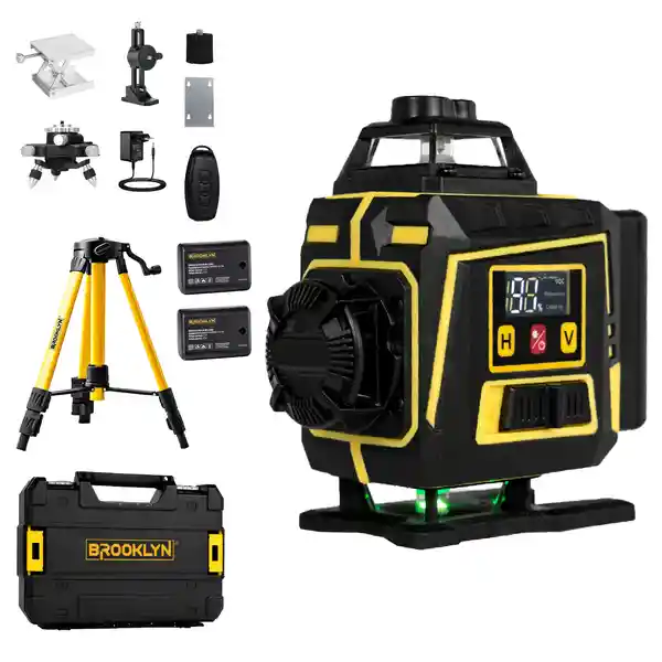 El Nivel Láser Verde Brooklyn 16 Líneas (360° x4) está pensado para instalaciones rápidas y prolijas: proyecta 4 planos completos 360° para trabajar con nivel, plomo y escuadra en toda la habitación sin estar moviendo el equipo a cada rato. - 16 líneas / 4 planos 360° (3D): cobertura total en paredes, piso y techo - Luz verde 515520 nm: alta visibilidad en interiores - Ideal para Cerámica y porcelanato, muebles de cocina, repisas, rieles, tabiques, cielos, perfilería e instalaciones en general. - Kit más completo: kit con estuche rígido para transportar + trípode. - Incluye pantalla para indicar nivel de batería - Diseño duradero: IP54 resistente al agua y al polvo para garantizar que puedas trabajar de forma normal y estable en condiciones de trabajo complejas. - Este láser de línea proporciona una rosca de montaje de 1/4" para fijación en trípode o poste de montaje. - Modo auto nivelación: cuando el péndulo está desbloqueado, la máquina se encenderá y se habilitará el modo auto nivelación. El haz láser parpadeará rápidamente cuando la herramienta esté ±3° fuera del rango autonivelante. - Modo manual: pulsa el botón V para entrar en el modo manual, la herramienta láser se puede colocar en cualquier ángulo para la alineación. ----------------------------------------------------------------------- FICHA TÉCNICA: - Láser verde 515520 nm - Luz Verde - 2 líneas horizontales / 2 líneas verticaes - Auto nivelación ±3° (se ajusta solo) - Precisión: ±2 mm / 10 m - Alcance: ~25 m de diámetro -IP54 (resiste polvo y salpicaduras) - Rosca para trípode: 1/4" -Tiempo de uso: 2.5 a 8 horas (según líneas activas) - Temperatura de trabajo: 5°C a 45°C - Baterías: Litio - Mayor durabilidad: incluye 2 baterías - Capacidad por batería: 2400 mAh/8.0 Wh - Voltaje nominal: 3.7 V - Voltaje máximo: 4.2 V - Medidas del nivelador: 12 x 10.4 x 9 cm - Peso: 543 grs ----------------------------------------------------------------------- 2 MODOS DE USO: Modo Manual: Cuando el interruptor se desliza hacia el lado de bloqueo, la herramienta bloquea la línea transversal y los rayos láser se pueden ajustar para alinearse fácilmente con sus demandas en cualquier ángulo del objetivo de medición. Modo Auto Nivelación: Equipado con un sistema de péndulo inteligente, el nivel láser puede nivelarse automáticamente dentro de ±3° ----------------------------------------------------------------------- QUE VIENE EN LA CAJA - Nivel láser verde 16 líneas (4 planos 360° / 3D) - 2 baterías recargables 2400 mAh - Trípode de aluminio de 1 metro - Soporte elevador de aluminio (base elevadora / lifting bracket) - Base triangular de aluminio (base con puntas / apoyo estable) - Soporte de pared (wall-mounted bracket) -Cargador - Maletín rígido (para transporte) - Manual **Brooklyn® es distribuida en Colombia y Sudamérica exclusivamente por Builder Commerce SAS**