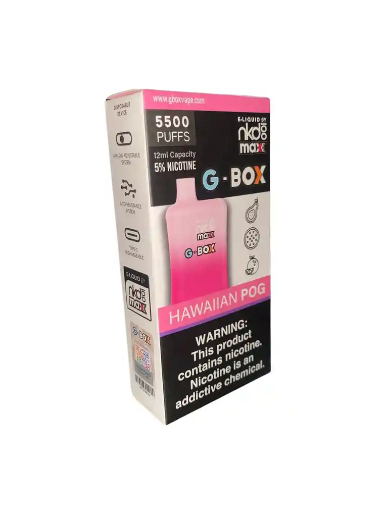 El vaporizador desechable Naked 100 Max G-Box Hawaiian Pog ofrece aproximadamente 5500 caladas de sabores a piña, naranja, guayaba y maracuyá con un 5 % de concentración de sales de nicotina.