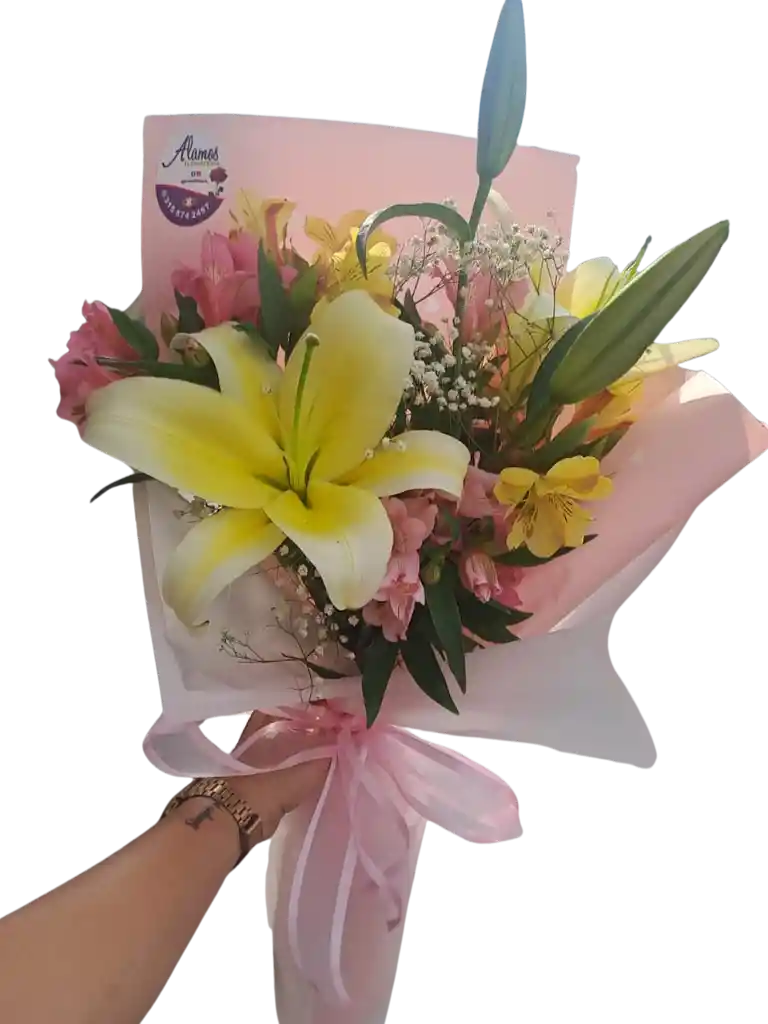Lirios amarillos, alstroemerias y gypsophila. Un bouquet luminoso y sincero con la delicadeza de una promesa bien hecha (incluye tarjeta personalizada).