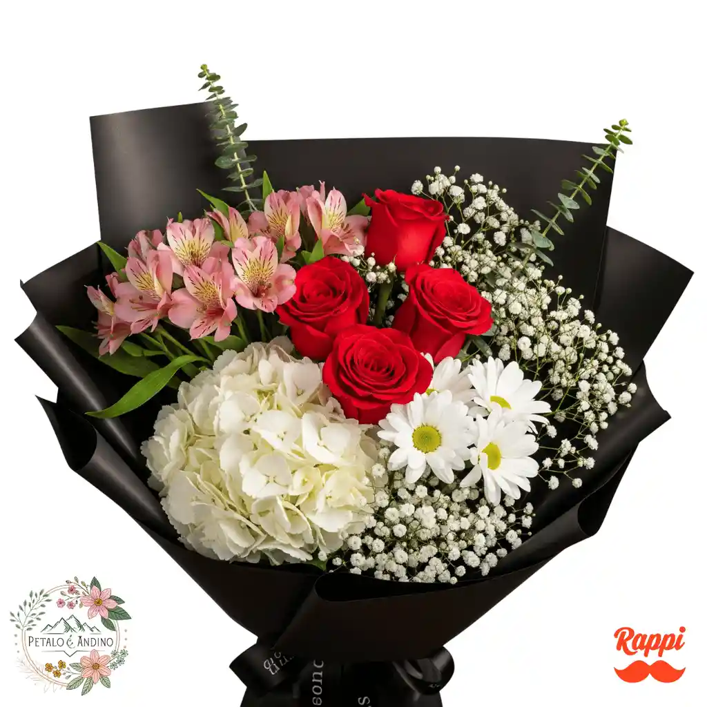 Hortensia blanca Rosas rojas Astromelias rosadas Margaritas blancas Ramitas de gipsófila Ramas de rusco