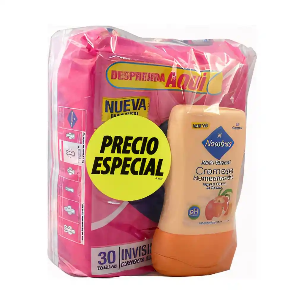 Este pack contiene toallas femeninas invisibles X 30 unidades tienen una suave cubierta tipo tela con aloe vera y manzanilla, humectantes naturales para evitar irritaciones, jabón íntimo que contiene colágeno que te brinda firmeza y vitalidad, con karité y extracto de avena que ayudan a suavizar tu piel y mejorar su elasticidad. packing: Bolsa