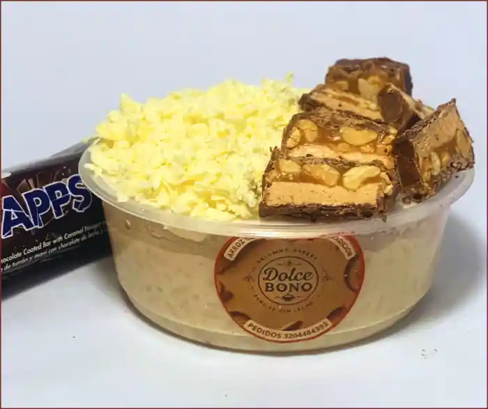Exquisito y cremoso arroz de leche de la abuela acompañado de deliciosos trozos de chocolatina de maní y caramelo con queso fresco