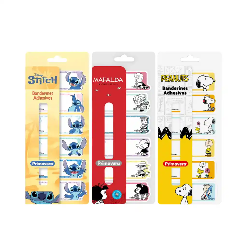 Banderitas adhesivas Primavera con diseños de Disney, Mafalda y Peanuts. Reposicionables, coloridas y perfectas para organizar tus apuntes.