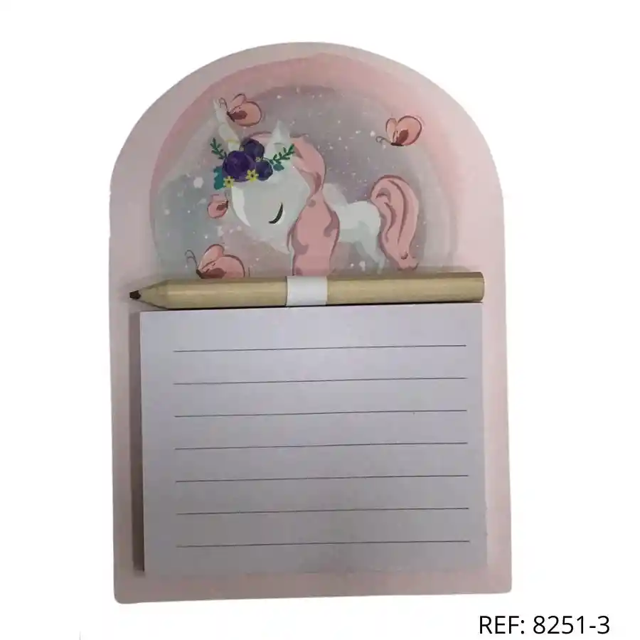 Bloc de notas unicornio con lápiz, ideal para apuntes rápidos. Diseño tierno y decorativo.