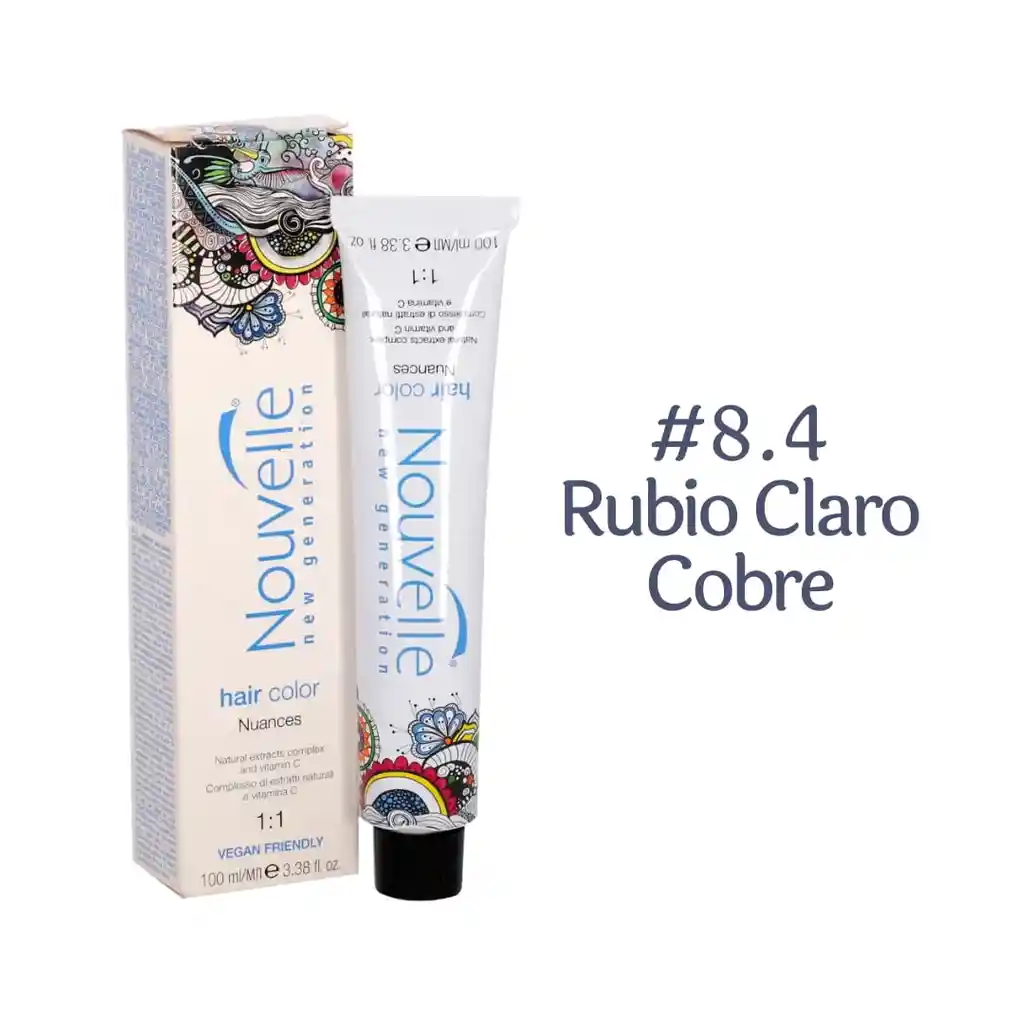 NOUVELLE TINTE 8.4 RUBIO CLARO COBRE 100 ML : Es un colorante en crema para el cabello de alto efecto protector gracias a un complejo vegetal y a sustancias cosméticas que garantizan la máxima integridad de la estructura del cabello, dando un resultado de color intenso y brillante.