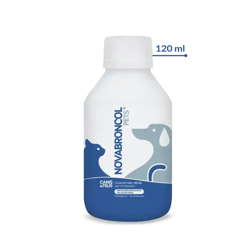 NOVABRONCOL PETS es un expectorante de acción directa. Ejerce licuefacción del moco, elimina secreciones bronquiales en neumonía, laringitis, faringitis, síndrome respiratorio crónico. contiene Bromhexina, el cual es un expectorante de acción directa, que al ser administrado por vía oral, produce un aumento de la cantidad de secreciones traqueo-bronquiales y una disminución de su viscosidad fluidificándolas facilitando así su eliminación. La Guaifenesina actúa como relajante de acción central ayudando a la expectoración.