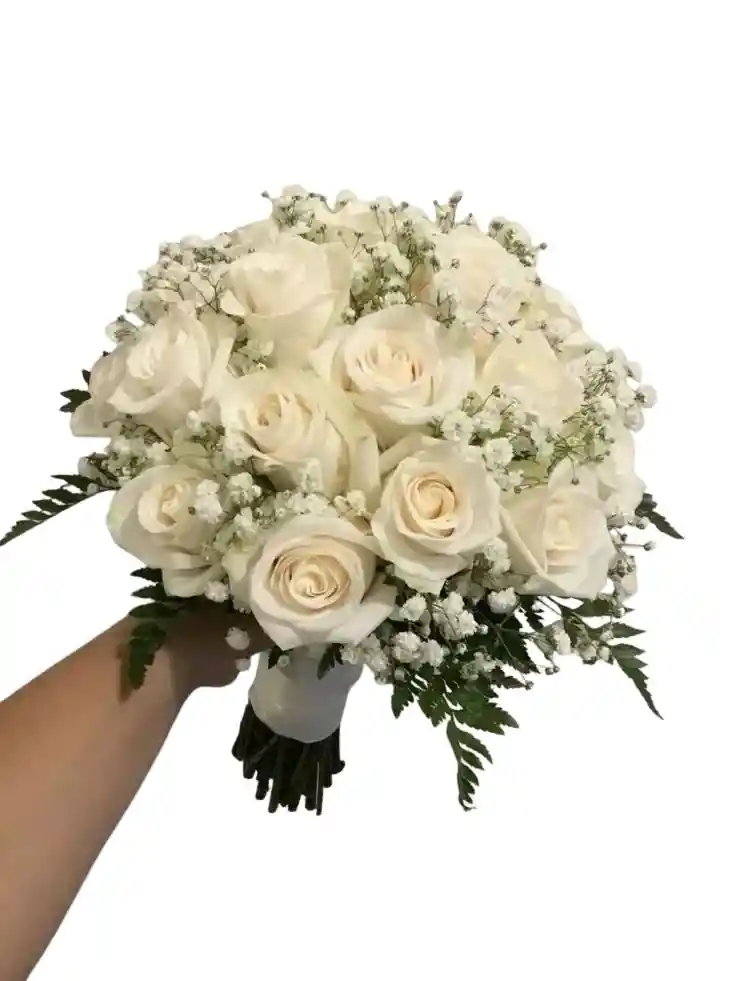 Bouquet de 24 rosas blancas con gypsophila Nota: La flor puede ser sustituida dependiendo la disponibilidad de color y del producto “Mensaje Personalizado” máximo de 30 caracteres (Dejar el mensaje en el chat, los comentarios no se previsualizan para la tienda por lo que si se dejan allí no podrá ser incluido).