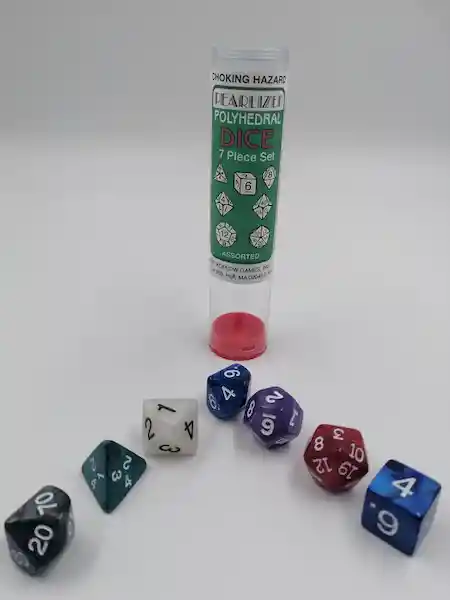 Paquete de Dados, Contiene: un Dado Con 4 Caras, un Dado Con 6 Caras, un Dado Con 8 Caras, un Dado Con 10 Caras, un Dado Porcentual, un Dado Con 12 Caras y un Dado Con 20 Caras.