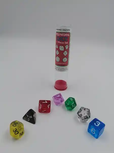 Pack Nueva Librería Francesa Dados Incluye: Dado Con 4 Caras 1 Und + Dado Con 6 Caras 1 Und + Dado Con 8 Caras 1 Und + Dado Con 10 Caras 1 Und + Dado Porcentual 1 Und + Dado Con 12 Caras + Dado Con 20 Caras 1 Und.
