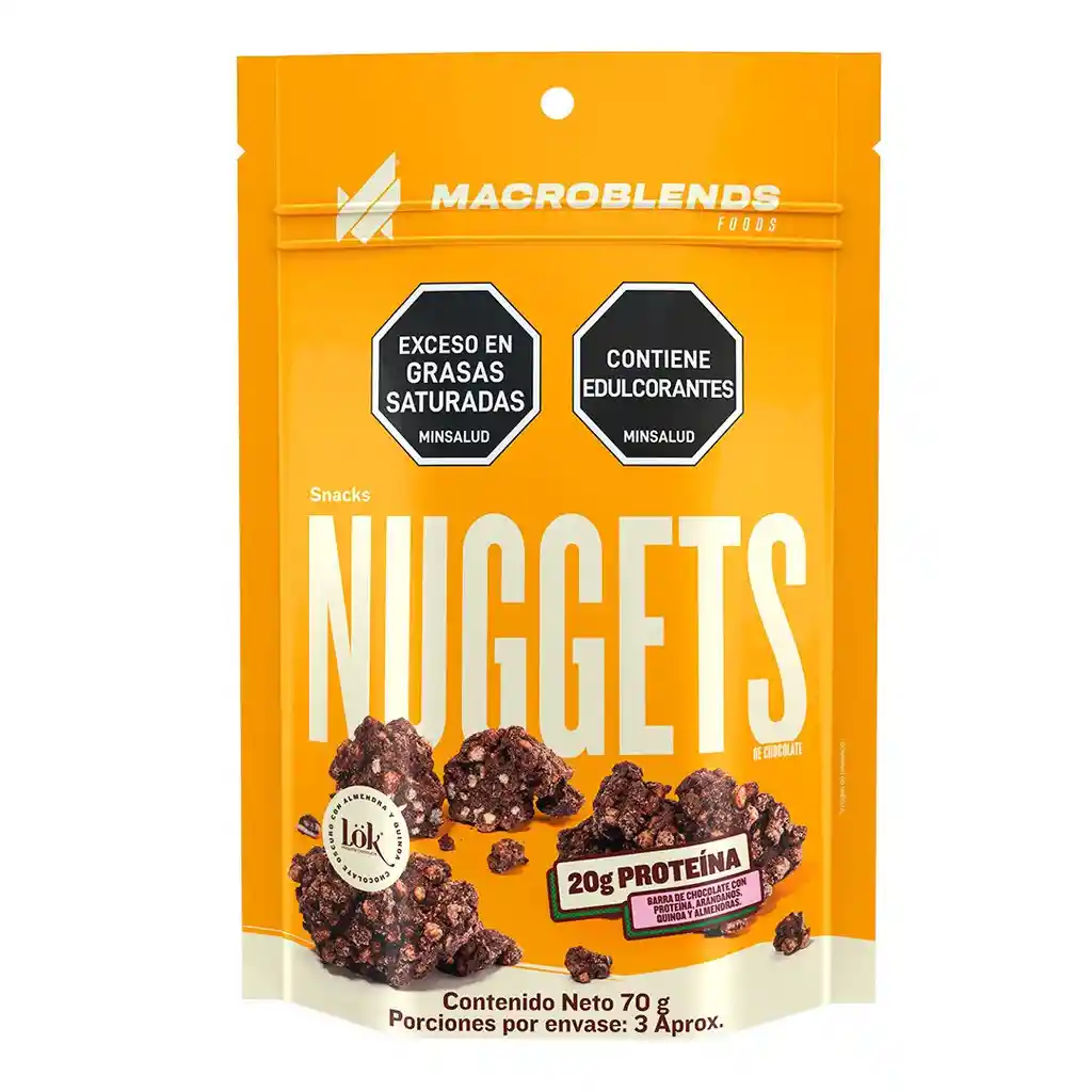 Los Nuggets de Macroblends son un snack saludable y crujiente, hecho de chocolate y enriquecido con 20 gramos de proteína. Estos nuggets están compuestos por cacao, arándanos, quinoa y almendras, y utilizan proteína de suero de leche para aumentar su valor nutricional1
