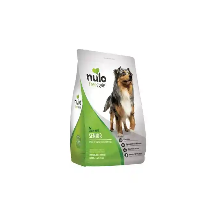 Nulo Senior libre de granos, nuestra fórmula para perros mayores incluye también Glucosamina y Condroitina para apoyar la salud de caderas y articulaciones.