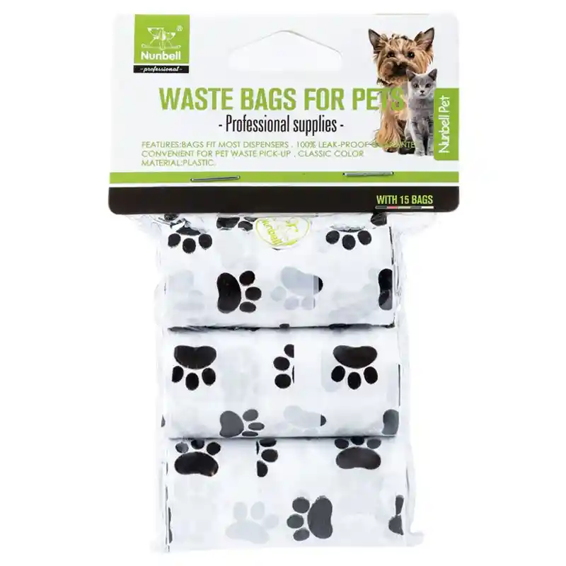 Set de 3 rollos de bolsas para desperdicios. Ideal para almacenar todo tipo de residuos. Cada rollo contiene 5 bolsas son elaboradas en plástico. Color blanco con diseño de huellas de color negro. Funcionan para dispensadores.