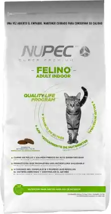 Nupec - Felino Indoor Adulto, tiene proteína de pollo de alto valor biológico que aporta los aminoácidos esenciales para una proteína altamente digestible, proteína de salmon el cual concentra grandes cantidades d ácidos grasos esenciales benéficos para la salud, arroz selecto el cual aporta la energía necesaria para un óptimo crecimiento