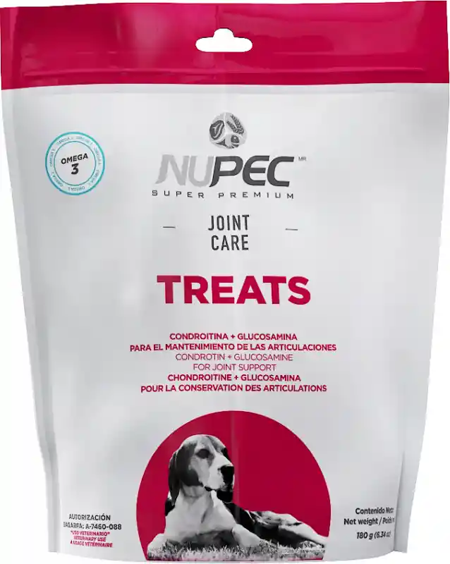 Nupec Treats Joint Care están formulados con ingredientes que ayudan a tu perro a fortalecer sus articulaciones. Los padecimientos osteoarticulares son comunes en las consultas veterinarias, sobre todo en perros de razas grandes, sin embargo pueden verse afectados perros de cualquier talla. Ventajas: Con glucosamina y condroitina que favorecen la regeneración de cartílago y sus componentes. Contiene Omega 3 que interviene en el proceso antiinflamatorio de las articulaciones Con vitamina E y C que ayudan al correcto funcionamiento del sistema circulatorio y evitan el daño celular. Auxiliar en perros con artritis. Cont 180gr