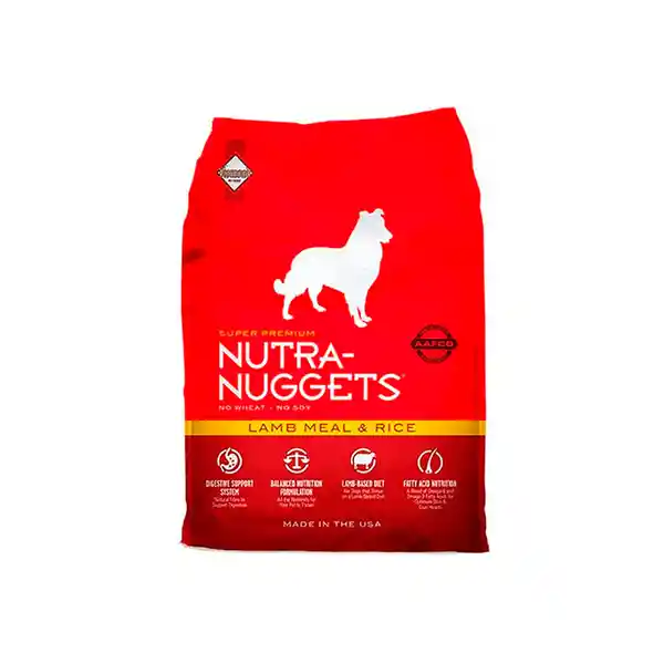 Nutra Nuggets Cordero y Arroz Piel y Digestión Sensible Para Perros Adultos Activos Con Una Actividad Física Entre Moderada e Intensa Contiene el Balance Correcto de Ácidos Grasos Omega 3 y 6 Para el Bienestar de la Piel y el Pelaje de su Perro Recomendado Para Perros Que Son Sensibles a Las Proteínas de Pollo y Carne Bovina Apto Para Perros Adultos Medianamente Activos Condroitina y Glucosamina Que Mantienen en Óptimas Condiciones Ligamentos y Articulaciones.