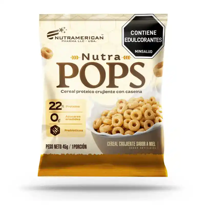 Nutra Pops, Cereal proteico crujiente con delicioso sabor a miel. 22% de proteína láctea de origen animal. Fórmula de absorción inteligente: 80% caseína de liberación prolongada y 20% proteína de suero. Adicionado con prebióticos para favorecer tu bienestar digestivo. Cero azúcares añadidos. Genera mayor saciedad por más tiempo, ideal para cualquier momento del día. Formatos convenientes: Caja Familiar (495 g) con sistema PractiPop y Multipack (10 x 45 g). Registro Invima: NSA-0020750-2025.