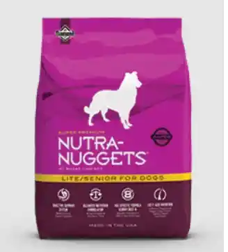 Alimento completo para perros Nutra-Nuggets Lite/Senior Formula, ideal para perros mayores, con sobrepeso o inactivos, proporciona los nutrientes esenciales necesarios para mantener la salud, pero con menos calorías. * Elaborada con harina de pollo, esta fórmula rica en nutrientes favorece la salud de las articulaciones pero también es sabrosa y satisfactoria. *Consulte a su veterinario antes de comenzar un programa de pérdida de peso para su perro.