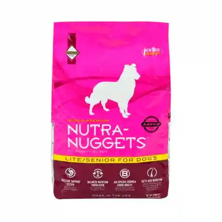 Nutra-Nuggets fórmula perros senior es un concentrado para perros maduros, ancianos, sedentarios o con sobrepeso que aporta una nutrición completa y balanceada pero con menos calorías y grasas. Posee un delicioso sabor y sus componentes de calidad favorecerán las articulaciones y la digestión de tu perro.